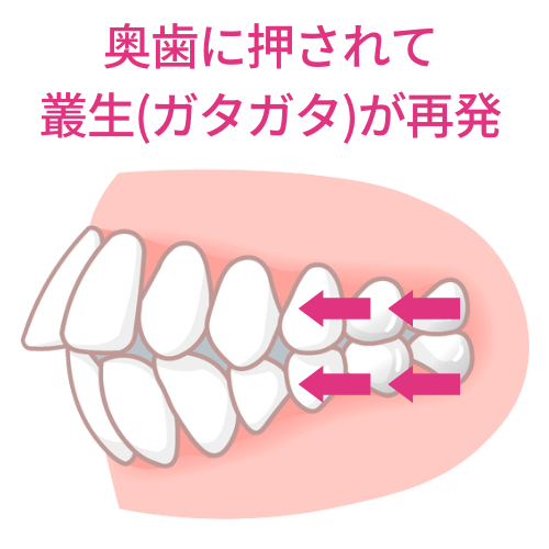 やがて前歯が斜めの奥歯に押し出されて、叢生(ガタガタ)が再発してしまう、というケースも決して少なくないのです。